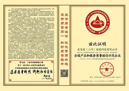 今年的3月15日,国际消费者权益保护日,爱思康产品再次通过中国质量检验协会测试检验,获得“全国产品和服务质量诚信示范企业”的荣誉称号!