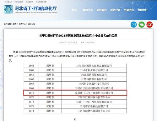 2023年8月31日,爱思康(三河)有限公司顺利拟通过河北省工信厅对创新型中小企业评价,已经进入公示阶段,为爱思康企业发展历程又添上了璀璨的一笔。
