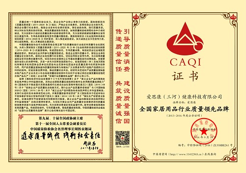在本届质量月活动中,爱思康(三河)健康科技有限公司获得全国家居用品行业质量领军企业,爱思康品牌获得全国家居用品行业质量领先品牌,并参加了2016年全国质量月企业展示活动。