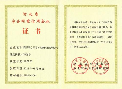 近日,爱思康(三河)健康科技有限公司,获得河北省信用协会授予的“河北省诚信共建企业”、“河北省守合同重信用企业”两项荣誉称号,并颁发了“河北省守合同重信用企业”荣誉证书。