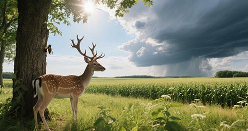 “昼晷已云极,宵漏自此长。”夏至,太阳直射北回归线,北半球白昼最长。这一日,阳光热烈,万物蓬勃生长,呈现出一派繁茂景象。古人云:“一候鹿角解;二候蝉始鸣;三候半夏生。”阳气盛极而衰,阳性的鹿角开始脱落;蝉感知阴气上升,振翅高歌;喜阴的半夏草也在此时生长。同时,夏至前后雷雨频繁,“东边日出西边雨,道是无晴却有晴”,骤雨带来清凉,也为自然增添灵动之美。
