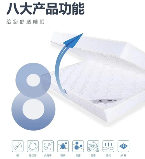 它汲取了长寿村巴马的地域特色,集成了“3D无簧弹性支撑系统”、“清爽洁净系统”、“优质家居微环境承载系统”三大系统,涵盖了,“透气、减压、抑菌、驱螨、防霉、远红外、负离子、生物效应磁矩阵”等八大功能,每一项功能均经过国际、国内权威检测机构检测。