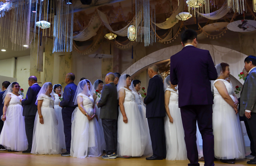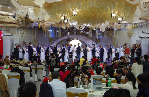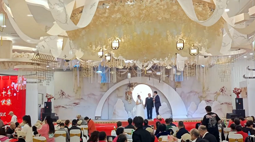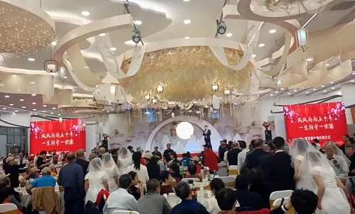 伴随着浪漫悠扬的结婚进行曲,48对金婚老人慢慢步入礼堂,金婚典礼正式开始!