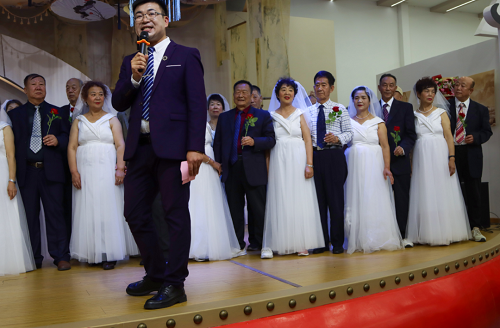紧接着到了典礼的重头戏,这些老人虽然已经步入耄耋之年,但依然保持着健康和活力。叔叔们手握着火红的玫瑰,抚摸爱人的发丝,重温结婚誓词,随后单膝跪地献上玫瑰。老人们互表爱意与谢意,脸上洋溢的笑容让人感受到执子之手、与子偕老的浪漫。