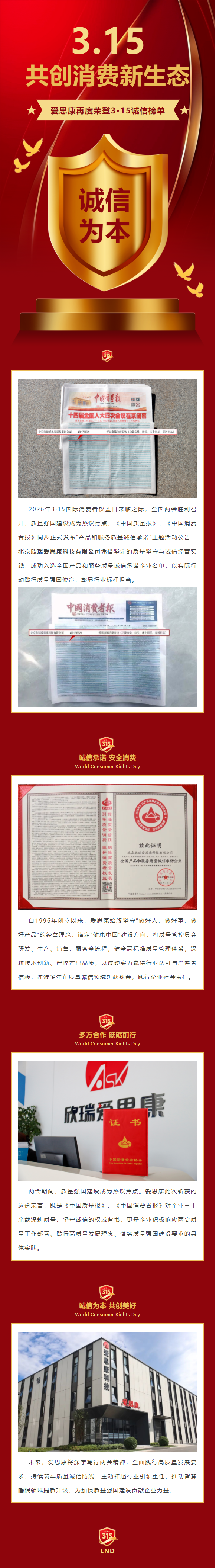 品质铸魂 诚信致远 爱思康荣登3·15诚信承诺企业榜单